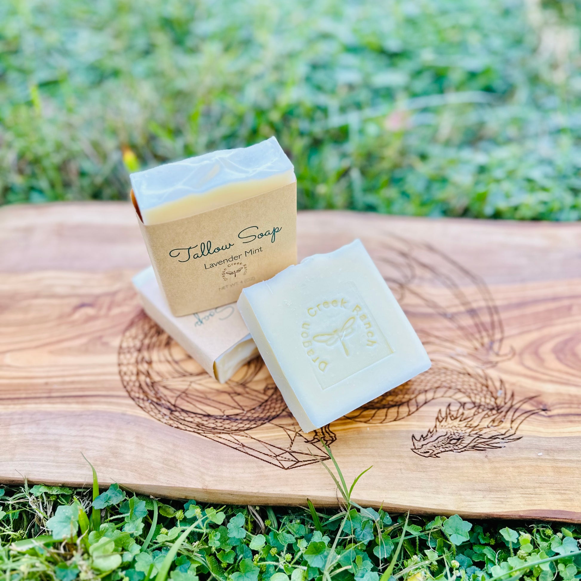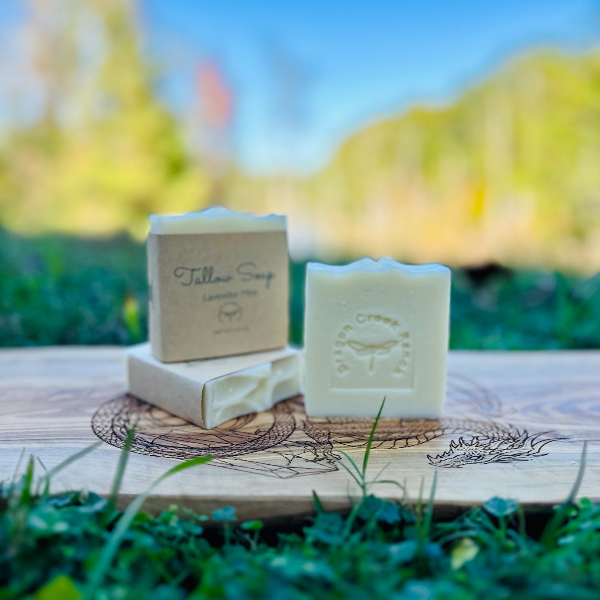 Ingredients: Grass-fed tallow, olive oil, coconut oil, castor oil, lavender essential oil, peppermint essential oil, kaolin clay, lye, and water.