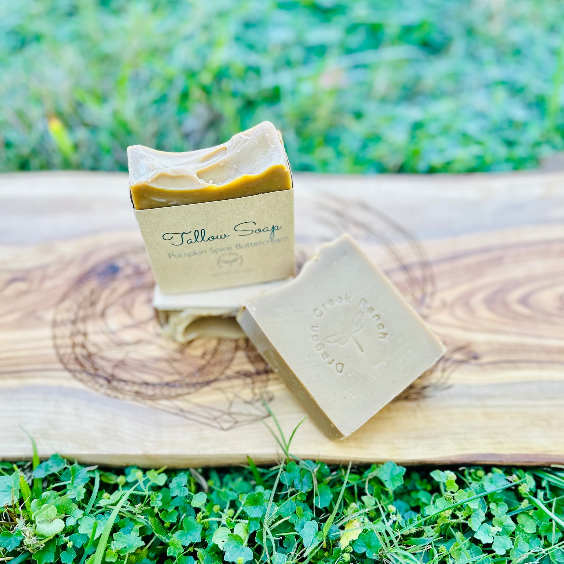 Bring the warmth of autumn to your daily routine with our Pumpkin Spice Buttercream Tallow Soap, handcrafted with grass-fed tallow from our small Georgia farm. This creamy, skin-loving bar blends olive oil, coconut oil, and castor oil for a rich, moisturizing lather that leaves skin soft and nourished.